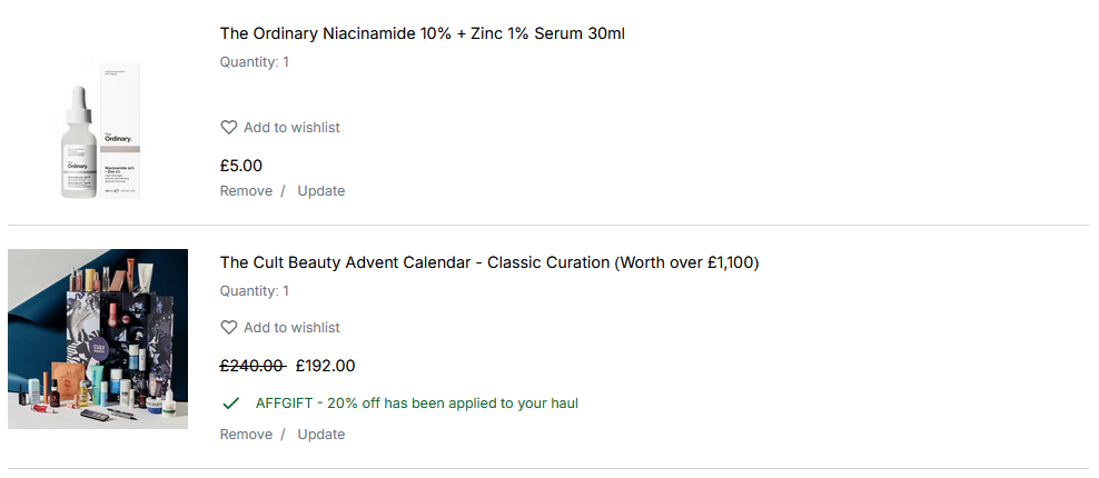 Looks like the promo code AFFADVENT works the other way around. Instead of giving you 20% off the rest of your haul, it gives you 20% off the Cult Beauty Advent Calendar. Limited time only until they fix it.