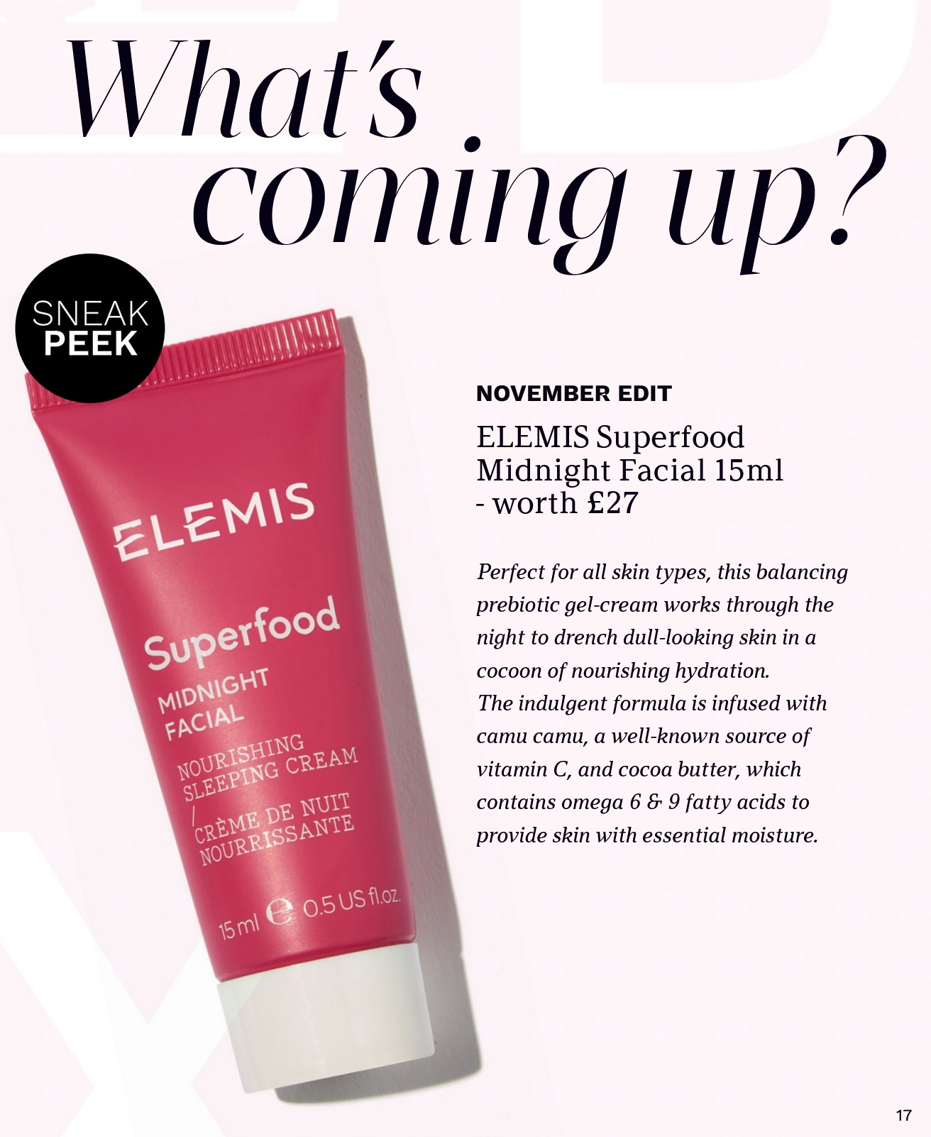 I have the first spoiler for the Lookfantastic Beauty Box November 2023. The November box will include Elemis Superfood Midnight Facial (15ml).
