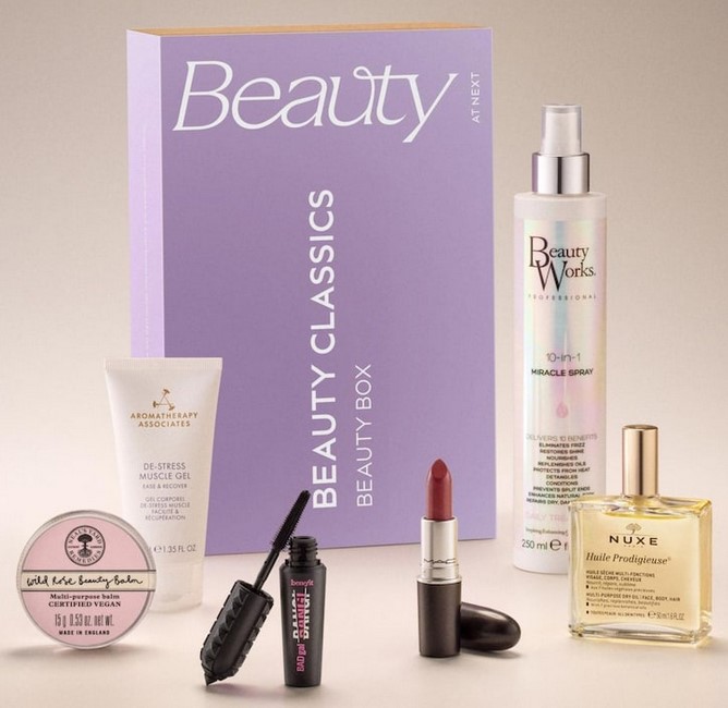 Next Beauty Classics Beauty Box 2026Next Beauty Classics Beauty Box (worth £94). Priced at £25.What’s inside:Nuxe Huile Prodigieuse Multi-Purpose Dry Oil for Face, Body and Hair 50mlMAC Twig LipstickBeauty Works 10-in-1 Miracle Spray 250mlBenefit Badgal Bang Mascara Mini 4gAromatherapy Associates De-Stress Muscle Gel 40mlNeals Yard Wild Rose Face Balm 15gShop here: next.co.uk
