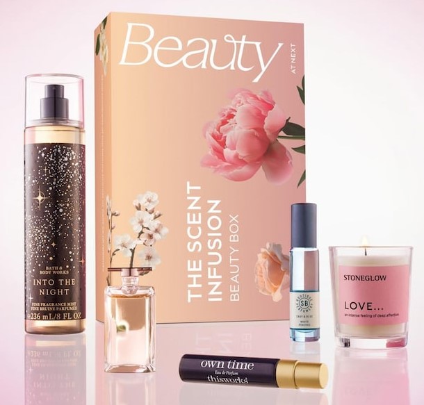 Next Scent Infusion Beauty Box 2026 Next Scent Infusion Beauty Box (worth over £62). Priced at £25. What’s inside: This Works, Own Time Fine Fragrance, 5ml (Travel size) Stoneglow, Love Gardenia & Sweet Pear Scented Candle Tumbler, 9cl (Travel size) Shay & Blue, White Peaches Eau De Parfume, 10ml (Travel size) Lancôme, Idole Eau De Toilette, 5ml (Travel size) Bath & Body Works, Into The Night Fragrance Mist, 236ml (Full size) Shop here: next.co.uk