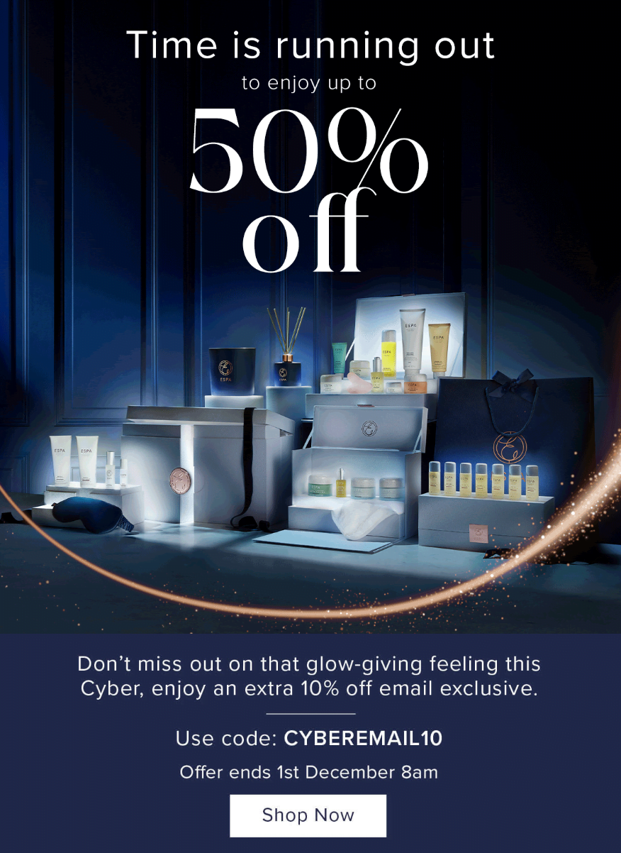 Up to 50% off at ESPA + an extra 10% with code CYBEREMAIL10.