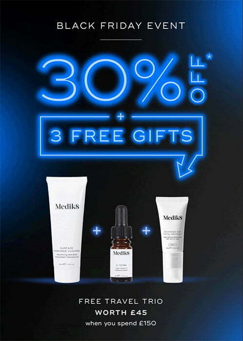 Black Friday at Medik8: 30% off + Free Travel Trio of Surface Radiance Cleanse, C-Tetra and Advanced Day Total Protect (worth £45) when you spend £150. Until 29/11